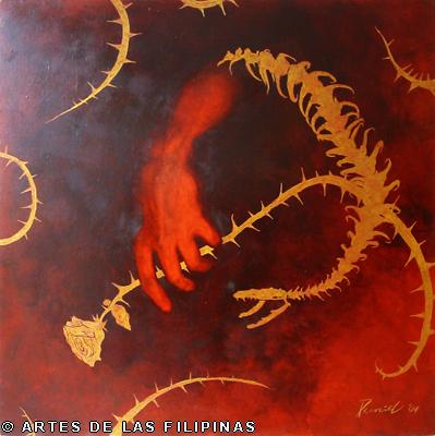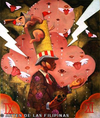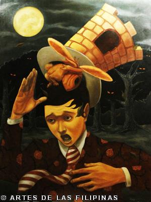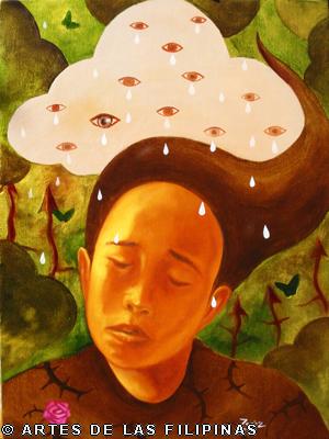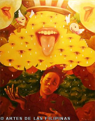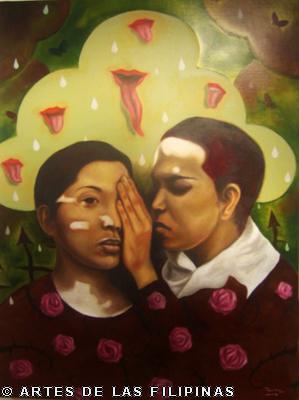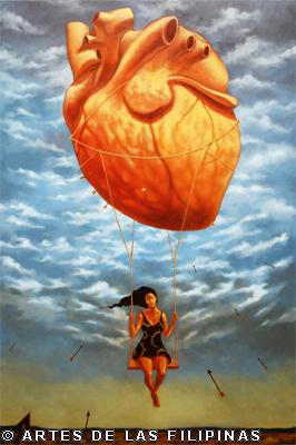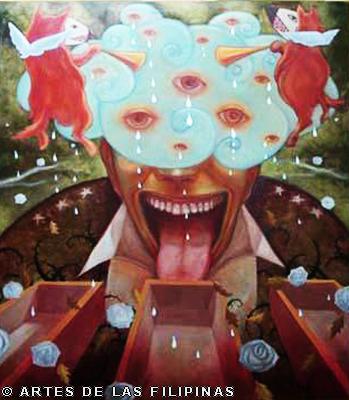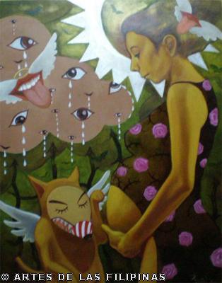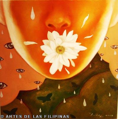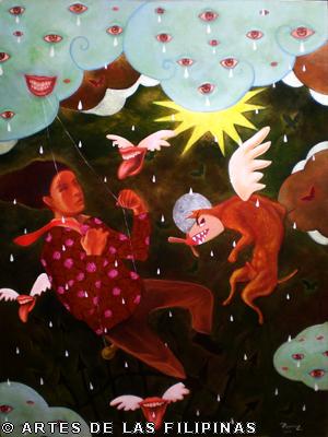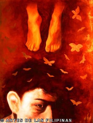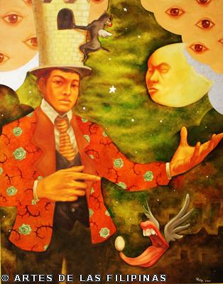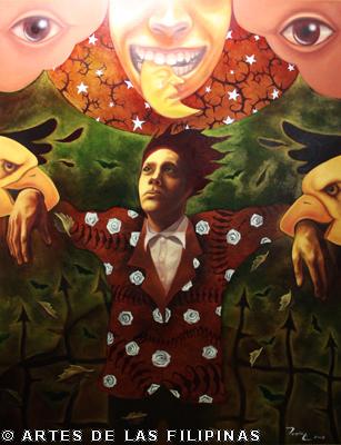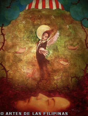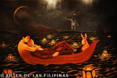 AUGUST 2012–Edrick Daniel began his career in 2004 painting figurative works that show the influence of surrealism. Fantasy, tales, relationship informed his early narratives. Later, he sought the foundation of a figurative symbolic art to usher the viewers into his metaphors and inner visions. In creating moods, he made use of props—boats, roses, eyes, tongues, birds, butterflies, moon, black water, suit case, animals and figures floating through the air and conjunctions of seemingly unrelated objects to tell a story, increase the element of enigma, upend, invert and collapse into terra incognita. In this interview, Edrick Daniel eloquently recounts his early life through his student years and artistic training, his companions and artistic colleagues and elucidates his influences which inspired his mature works. Edrick Daniel’s sharpness, sensibility, honest, frank and unabashed thoughts and opinions prove that he is no quack or charlatan but a fascinating portrait of a young painter who live his life with panache, deftly wrapping talent into his art.