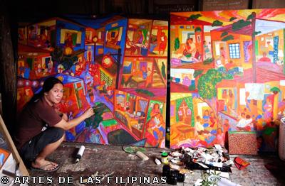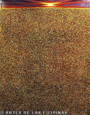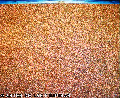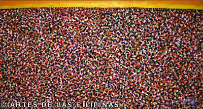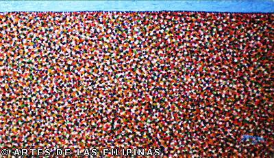 In 2007, noong nag-show ako sa Big n Small Gallery, na-discover ko yung tuldok-tuldok or dot paintings ko. Hinde naman talaga tuldok yung mga nauna kong gawa. Maliliit na pahid or brush strokes lang ang mga ito at mga maliliit na tao. Tapos doon ko naiisip na parang tuldok nga silang tingnan sa malayuan. Kaya sinimplify ko pa, hanggang sa naging tuldok na talaga. Binalik ko lang ulit itong series ko na tuldok noong 2009. Tapos tuloy-tuloy ko nang ginagawa. Masarap kasing gawin, parang therapeutic.