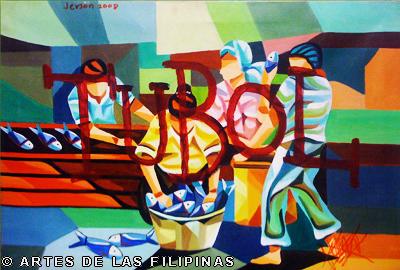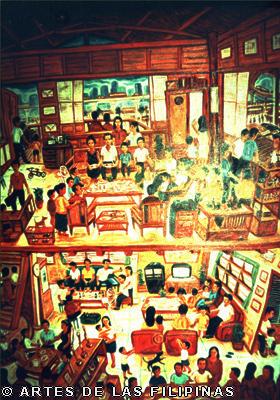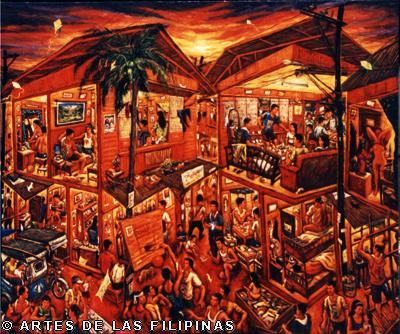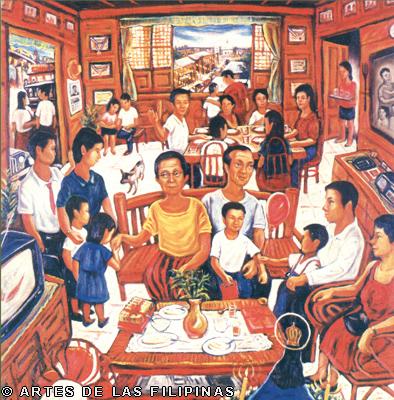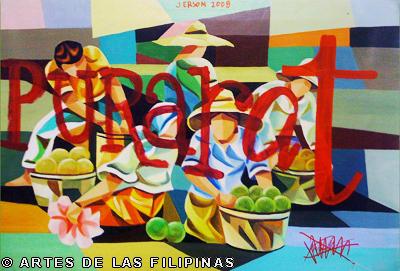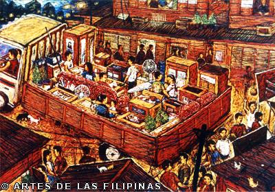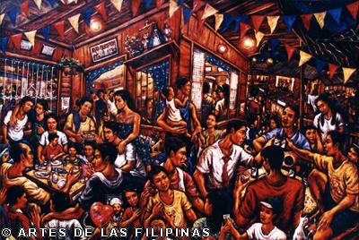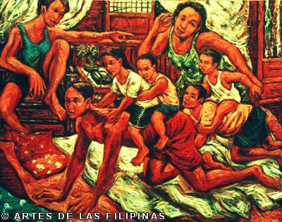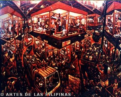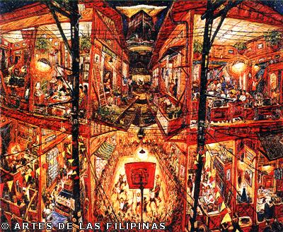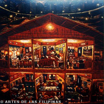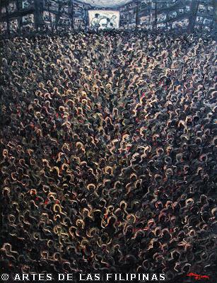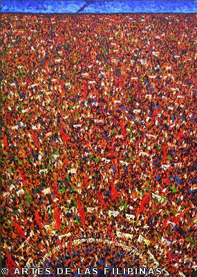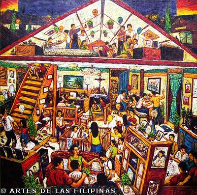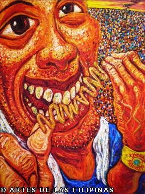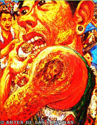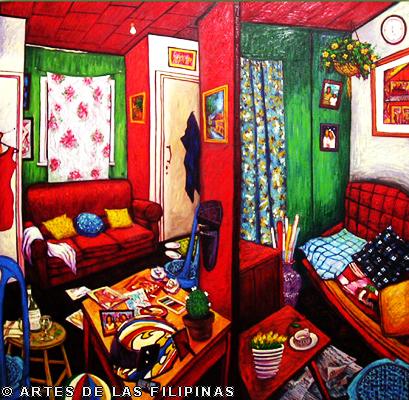 November-December 2014--Jerson Samson, during his freshman year at the University of the Philippines College of Fine Arts (UP CFA), started making a name for himself when his entries, Tukso and Nakaligtaang Kalikasan were finalists at the 27th Shell National Students Art Competition in 1994. He played his cards right that in 1997, his piece, Alay 1 was awarded honorable mention at the Metrobank Foundation Young Painters Annual and his other entry, Pasasalamat kina Lolo at Lola was the Juror’s Choice at the Art Association of the Philippines Annual Art Competition Representational Category. In 1999, he was among the Top 5 awardees at the Philip Morris Philippine Art Awards which led him to exhibit his piece, Nagsisikip na ding-ding during the Asean Art Awards at the National Gallery in Kuala Lumpur, Malaysia. All these times, Samson had given the art viewing public a peek of the Antipolo neighborhood he grew up in where from a house apposite, from an upstair room, at no great distance, the inhabitants’ bustling activities and domestic interiors scenes were free-to-view–his personal and private response to primeval scenes he nonchalantly espied and depicted using saturated colors. In 2002, he opened his first one-man exhibition, Tahanan at the Boston Gallery where his ten paintings of house exteriors and interiors that showed the public lives of common Filipino families were sold out. Samson broached a new approach of painting crowds out in the street watching political and religious happenings in his show, Masa Para sa Masa in 2007 at the Big and Small Gallery. Chief among his works were Erap, Pacquiao and Sale: Window Shopping. Masses’ activities and scatological humor continued to mark some of Samson’s newer outputs as echoed in his Hunger Strike and Tibe, Tubol and Purarat series yet he often went back to painting his roomy interiors