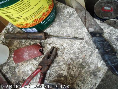 When it comes to tools, traditional and modern/mechanized tools are used by both sculptors. Although hand-held power tools are utilized to improve their carving efficiency and simplify the carving process, they still use traditional equipment such as mallets, gouges and chisels, as they are better at carving inlays and engraving. Flores particularly relies heavily on traditional tools such as mallets and chisels, carving knives, saw and sandpaper.