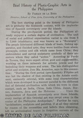 I will conclude with the following phrases of a great Spanish art critic: “Art, because of its abstract character, its spiritual nature, is always at the head of all psychic energies, looking in the infinite the supreme human ideal. For this reason, art cannot be subject to anything nor to anybody; for this reason art needs complete freedom where it can move, develop and expand, and for this reason it sides always with the political and religious schools which offer broader horizons to man.” NOTE: The article, Brief History of Plastic-Graphic Arts in the Philippines written by Fabian de la Rosa that appeared as a chapter in the book, Encyclopedia of the Philippines The Literary of Philippine Literature Art and Science Volume Four published by P. Vera & Sons Company in 1935. To the best of the knowledge of Artes de las Filipinas, this article is no longer protected by copyright. This work is made available on this site for the sole purpose of information and is not made available for commercial purposes.