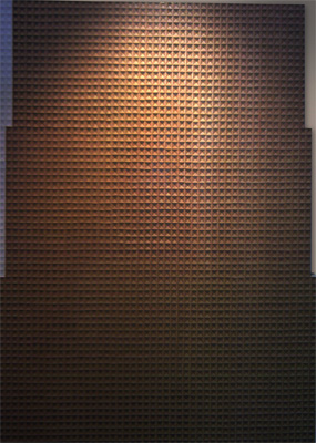 My entry work in the 2006 Philippine Art Awards is entitled “Blink” which are squares that links triangles of different tones. Squares fill the entire space, forming a lofty pyramid tower with stairways on its edge. The shaped canvas on the right appears to duplicate an illusion on its left, like trompe l’oeil. I also made this work as a quick eye movement. Defining space and time between then and now, between reality and the imaginary; an enigma in one’s memory whether it is reality of existence or just perceived reality.