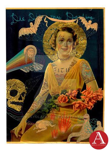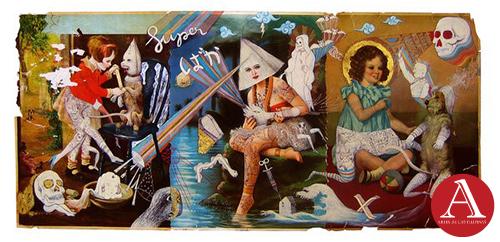 My second solo show was held in Silverlens in 2011. The title of the show suggests that this group of letter is an image or vice-versa. But to people who understand this symbol, it means “rock on!” This time, the collection that I put out questioned our faith. I used two different images of idols. The first idol is the one that we worship in church or in the altar of our homes. The second one is the idol that we worship in the world of rock and roll. They are two different images but are linked together in some aspects; one is that both are objects of worship. To give a more visual example, I used an image of Jesus Christ for this show because he resembles the rockers who we idolize as we praise and rejoice with them during concerts. If you could study my series called “Hey Idol, How you Doin’?” there, I painted a sculpture of the risen Christ tattooed like a rock star and covered with black seamless robes, as opposed to the real image of Jesus Christ. The risen Christ was portrayed as a rock star, provoking religious viewers if they find offense to it. I got disappointed! I never heard any negative feedbacks from my works at all! Maybe because it wasn’t shown to a more conservative audience. At the center of the space, I put large-scale photographic works that illuminated the small room. I called this a mini chapel. To complete this look, I painted the room with random images of Jesus Christ and some famous rock stars, mixing them with human skeletons and big skulls, hence, suggesting that life and death is nonsensical if we worship the wrong idols. The images that I put there were composed of a grungy looking guy, a fan of some rock star having KISS make up on his face while hugging Mother Mary. He wore vandalized robes and David Bowie make up. Mama Mary is carrying baby Jesus who I portrayed as having an origamish abstract face to symbolize that he is not human. Jesus may be an alien or something like that. On the upper part of the chapel were three images of Jesus Christ which I depicted as a genie, tattooed and ready to grant your three wishes. At the bottom part was an eye-pleasing flame that represent hell or eternal flame. And oh the guy’s body has no skin; his muscles look like a steak and ready to be eaten by whoever meat lover was in town. I called that piece, “God Bless The Rock Star.” This is my link: http://dexfernandez.blogspot.com/2011/02/m.html.