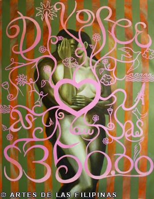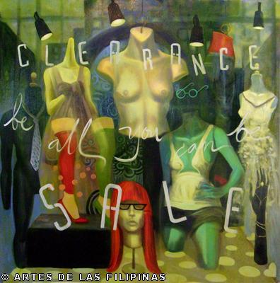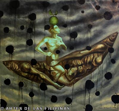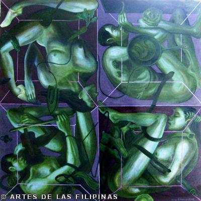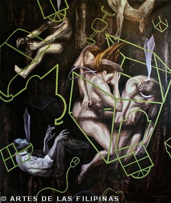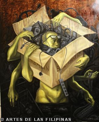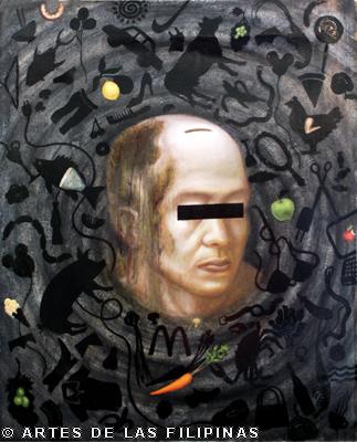 In the mid-1980s and as a result of Roberto Chabet’s effective method in cultivating his student’s own language, I was already exploring my personal symbology that is characterized by quasi-surreal imagery. Then later at the end of the decade until the early 1990s, this imagery blended into Social Realist themes. From 1992- 2002, I was doing paintings based directly on observed and/or experienced situations. These works were done in monochromes and were rendered in heavy chiaroscuro and impasto-like application. There was a lot of intensity in these works and I am mostly known for these. In 2004, I have been exhibiting paintings similar to what I have already explored in the 1980s. These works were characterized by the use of color and symbolism but were all inspired by my reflections on society, the workings of ideology and lament on individual struggles. Now, I explore juxtaposing images and superimposing graphic elements on top of my traditional figuration.