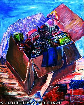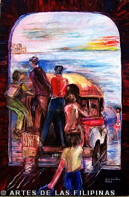 My first exhibit was at the Institute of Tourism in 1987. It was a group show with my classmates. I was attracted then to themes depicting social-realism. My oil painting was “Paano Uuwi si Ana” that showed Ana flagging a moving jeepney full of “sabit” passengers seen from a rear jeepney view. That painting is with Dr, Ibe, former regent of UP in the 1990s. Then I did another one #2 with the same theme, that won an Award of Excellence from Shell, exhibited at the Quad and purchased by Architect Dong Arguelles whom I still have to meet. The same scene #3, I repeated here in the US and now owned by a collector. Since the Institute of Tourism show was a minor exhibit, there was not much fanfare.
