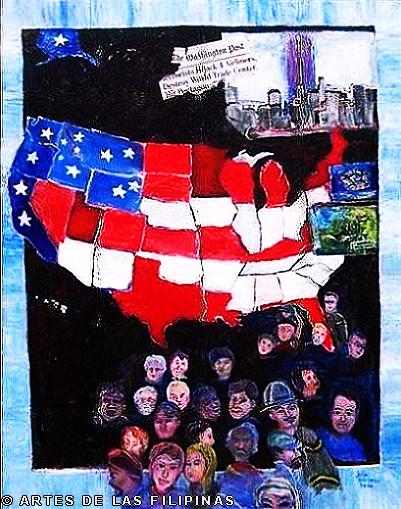 For my other abstract compositions, my take off spring from unusual colors, lines forms or shapes, or a combination of all that I put together to form a composition. Usually, a recognizable object finds its way in the painting. When Barack Obama was elected, I had this idea to paint his portrait in various colors but someone beat me to it. Although mine was late in the coming, I still did it, my own way. I also did a large 9-11 painting immediately after the bombing of the Twin Towers which showed different ethnicities. I titled this “One Country, One People.” This particular painting of mine has been exhibited many times here.
