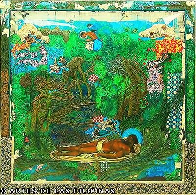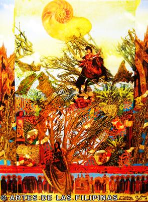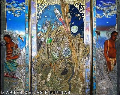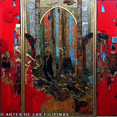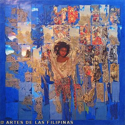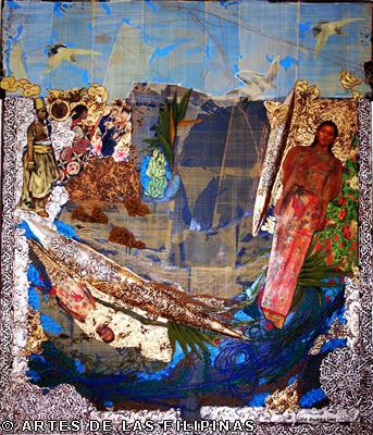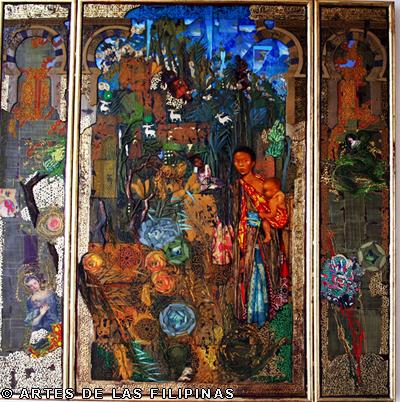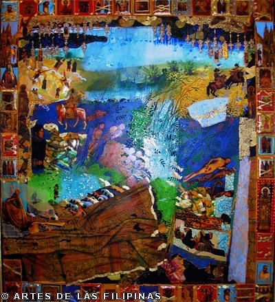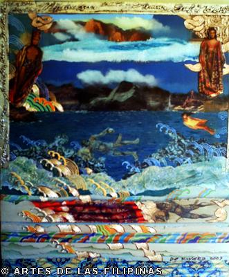But it was the earlier 2001 work “Nuestra Eden Perdido” (Our Endangered Eden) which pushed De Rivera to the international art scene when he won the Excellence Award in March 2003 from the Beppu Contemporary Art Exhibits in Japan, besting a thousand entries from across the world. A triptych, the work is a superb symphony of colours, fragments and textures, contemplating on the slow demise of the natural world and the innocent. As described by critics the piece shows “… mutated flowers meeting spaceships and modern icons like rum bottle labels, fabric swatches and postage stamps, flanked by a Madonna and child and a bahag-clad (loin cloth) denizen of simpler times and places.”