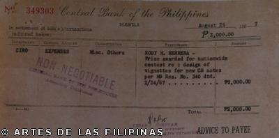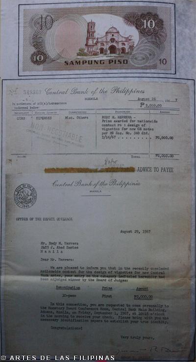 In 1967, Herrera’s design of vignette for the ten peso bill was adjudged winner at the nationwide contest sponsored by the Central Bank of the Philippines.