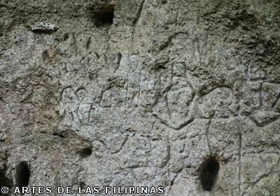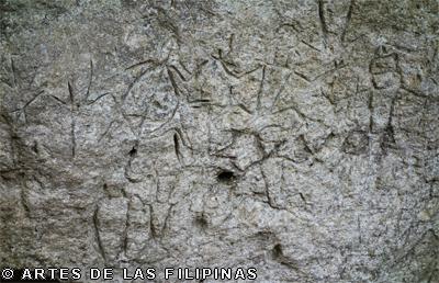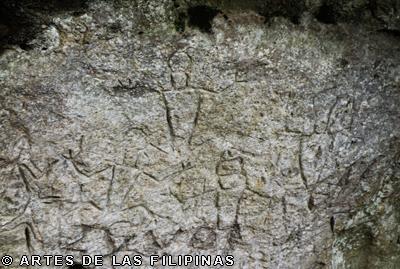 The site of the Angono Petroglyphs is a shallow rockshelter measuring about 63 meters wide, eight meters deep and five meters at the highest point. It is formed in volcanic tuffs of the Quaternary, the shelter probably having been created as a result of faulting. One hundred twenty seven drawings (127) are still visible in the form of animate figures, generally a circular or domelike head on top of a vee-shaped torso. The flexed arms and legs are linear sometimes provided with digits. The drawings are distributed on a horizontal plane on the rock wall area measuring twenty five meters by three meters. The drawings are engravings into the volcanic tuff which was soft enough to be worked by a denser piece of stone. Of the one hundred twenty seven figures, fifty one are distinct types, suggesting that the engravings were done by many individuals.The Angono petroglyphs are comprised of static figures. The engraving appears to be product of an associated ritual where the subject is depicted as the object of some affection.
