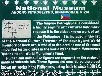 In August 1973, by virtue of Presidential Decre No. 260, declared oldest known work of art in the Philippines, the Angono Petroglyphs on the wall of rockshelter in Binangonan, Rizal, a National Cultural Treasure. In 1985, the Angono Petroglyphs have been included in the World Inventory of Rock Art under the auspices of UNESCO, ICOM, ICOMOS, ICCROM, under the Standard Rock Art Files (RAS), together with other world famous prehistoric rock art.