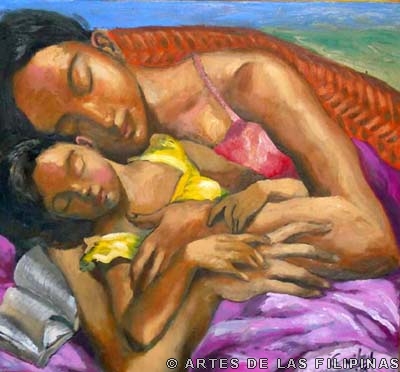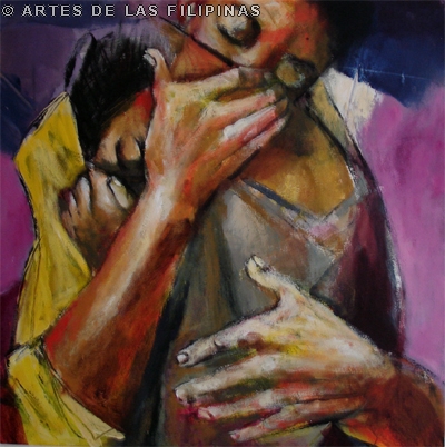 In Pagbabalik Loob (2002), Garibay portrayed a powerful image of a man embracing a child. He allowed the emotion to come forward out of two faces; devoiding the canvas with any other details. It proposed a new paradigm for the presentation of a common theme but of particular value to viewers but thoroughly accessible and of real interest to a casual observer. Garibay often played games with scale by employing enormous precision to depict a feature at a great distance, he does this very well in his emphasis with the hands of his subjects. Garibay’s execution of hands is both symbolic and expressive. Like the great master sculptor, Auguste Rodin, Garibay saw the hands as able to express the emotions of the entire body. Hands become important tools of expressions and are points of connection and passing between people.