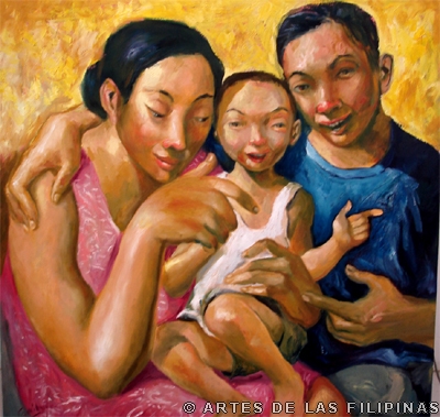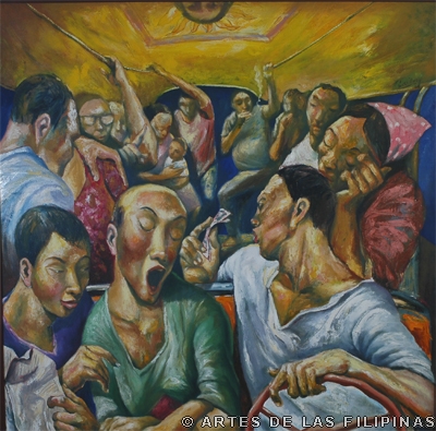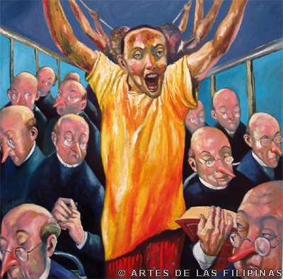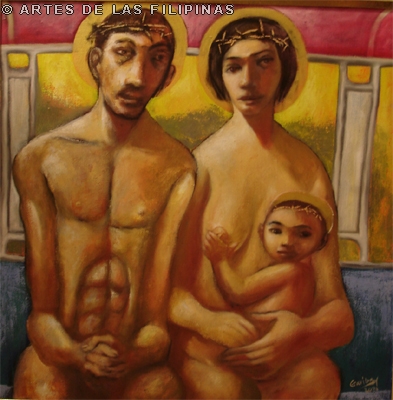 A different kind of story is presented in Sagrada Familia (2000) with the haloed Joseph in crowning thorns in the company of Mary and the little boy Jesus pinching his mother’s left nipple. The artist offers food for thought as well as curiosity to those who view this work. Why is the Holy Family naked inside a jeepney in the modern world? There was nothing casual about the composition, nothing at all. Garibay created a thought-provoking composition that tears apart the construction of family. The spiritual atmosphere that the subjects deserve was lifted from the clichés of parenthood: the over-protective father and the self-sacrificing mother. This time he took the subject out of their context and experimented with the subject’s form, gesture, and expression. This piece is kept from the sentimentality inherent in his other works and perhaps be best explained by an analysis of the artist’s early life, in which traditional Filipino values vied with the influence of radical modern ideas. Garibay produced many pieces in this manner.